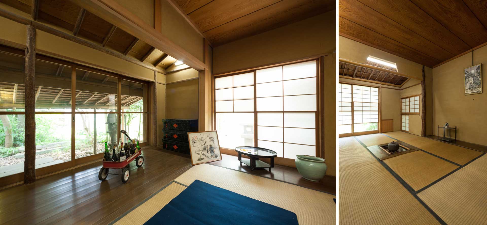 「囲炉裏のある和室は、茶室風に水屋を作り、炉を切り、平板や躙口を設けて、床の柱や水屋の天井などに凝った材料を使った。この大工は那須さんのお世話によるもので、那須良輔宅、里見弴宅、小林秀雄宅などを手掛けた名大工であった。老体をひっさげて見事な仕事をした。閑先生は注文がむずかしいが、彼もなかなか自説を曲げない。時に喧嘩もした。用材については、一緒にタクシーで銘木屋へ出かけて、あれこれとたくさん高価な材木を選んで使っている。」(門倉文枝「朝井閑右衛門 思い出すことなど」より)