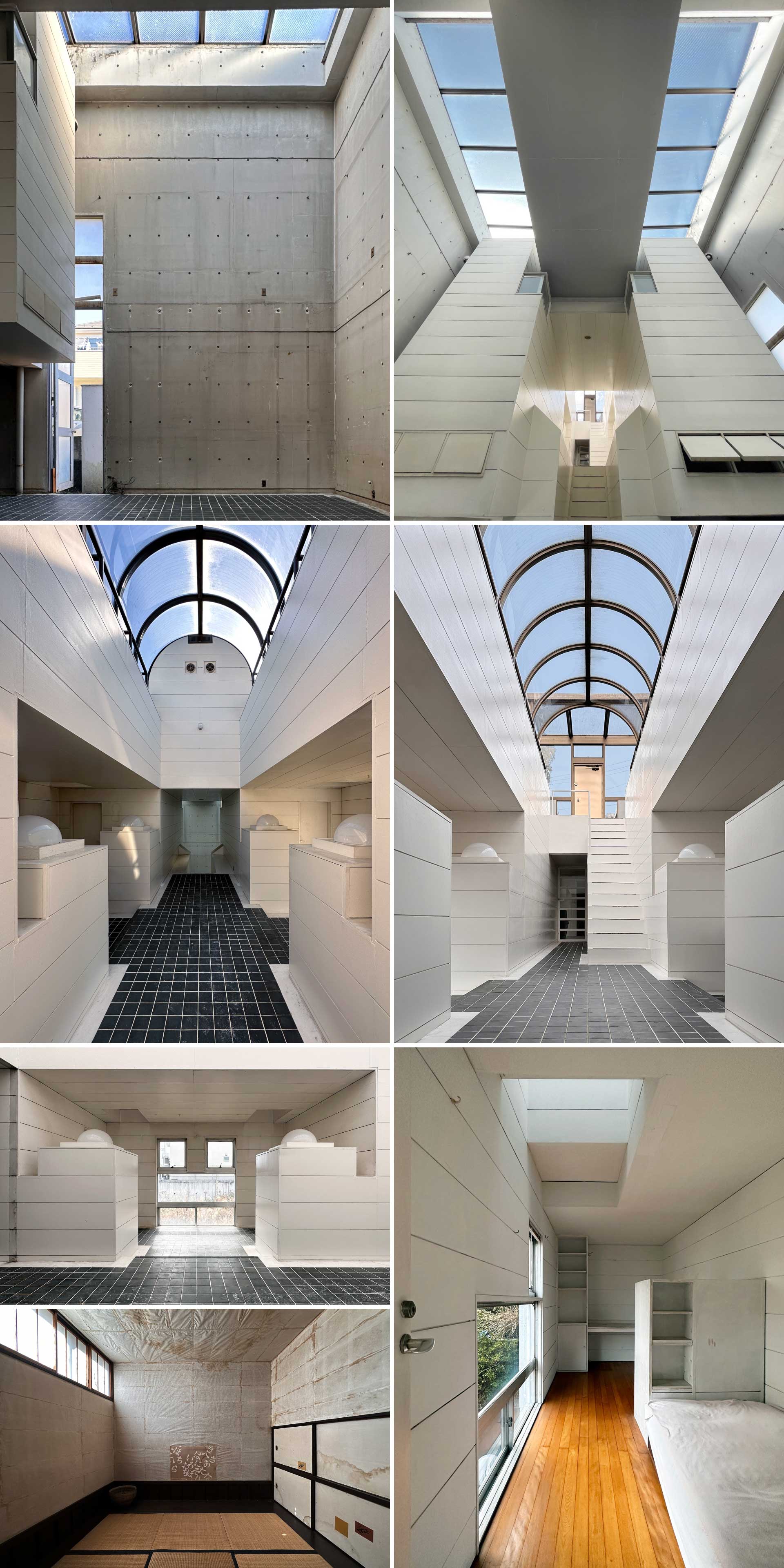 粟津邸は,設計当初は自然環境の中にあったが,周辺はすぐさま樹木等がなくなることが予想されていたので,こうした住居形式が考えられた。<内核>は,都市の中の小さな中心であり,都市の中心に従属するのではなく,自立的な住居として成立すべく構想された。地形に合せて高い位置からアプローチし,低い方向に空間が広がってゆく<下向>の概念が設計上の重要な指針であった。この住居形式は,集落調査の開始前につくられ,粟津邸の施工中に第1回の調査が行われた。この住居形式が砂漠の住居に類似していることを知り,以後建てられた住居には,部分的に砂漠の住居の原理を参照してもいる。