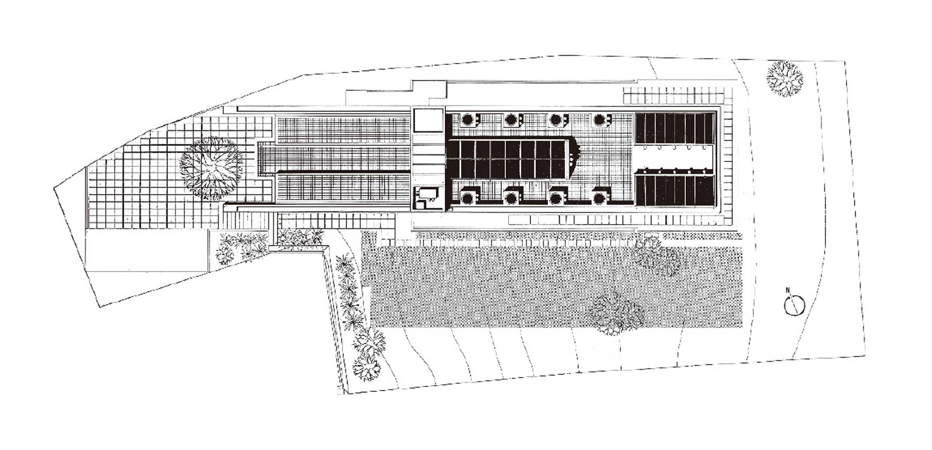 (5)外壁面は,庭や樹木等に対してのみ開かれた比較的閉鎖性の高い面とし,空気は換気塔の原理で垂直に動くように計画する。