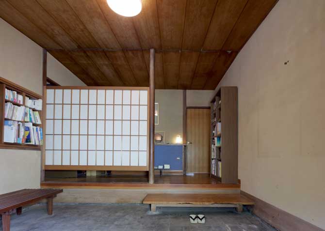 本住宅は、浜⼝ミホの作品群のなかでも⽐較的珍しい、和⾵意匠を基調とした外観の⽊造住宅である。敷地内には、⻄南に1935年(昭和10年)竣⼯の純和⾵の書斎、東北隅に書庫がすでに建っており、本計画では、それら既存建物との関係性を尊重しながら、⻄北の⼀⾓に、施主夫妻のための居間、寝室、台所、⽔回りを新たに設け、内部動線によって相互に連結することが求められた。多くの来客を迎える施主の⽣活に配慮し、⽞関は応接の場としても機能する、ゆとりある空間として計画されている。