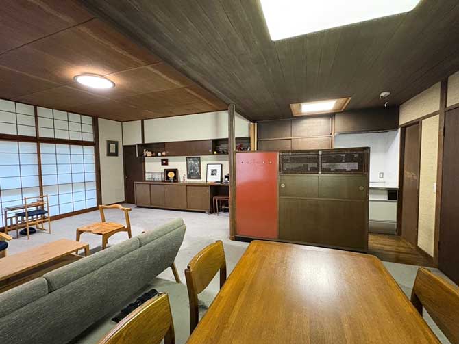 居間には、東からの朝⽇と南側の庭景を取り込む⼤開⼝が設けられ、四季の移ろいや敷地内に暮らす家族の気配を感じ取れる、穏やかで開放的な居場所がつくられている。⼀⽅で、⾷堂および台所は、居間と視覚的には連続しながらも天井⾼を抑えることで、空間としては明確に性格づけられている。トップライトによって柔らかな⾃然光が導かれ、作業と⾷事の場にふさわしい、落ち着いた明るさが確保されている点も特徴的である。台所は、ステンレス製のキッチンを中⼼に、浜⼝ミホが⼀貫して重視してきた、無駄のない⼨法計画と豊富な造り付け収納によって構成されており、限られた⾯積のなかで⾼い機能性と作業効率が実現されている。また、居間を経由することなく、引き⼾によって直接勝⼿⼝へとつながる動線が設けられており、⽇常的な家事の流れと、来客を迎える際の動線とが過度に交錯しないよう、細やかな配慮がなされている。