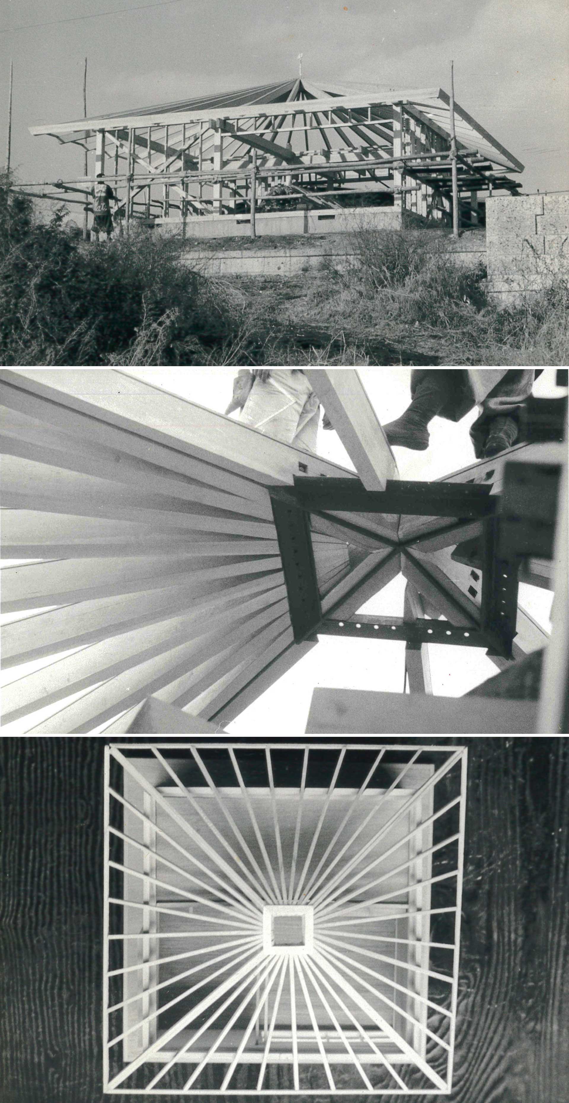 正方形の平面、方形の屋根は前々作、狛江の家(『新建築』60年4月号)のテーマのひとつであったが、ここでは単純化と明確化がすすめられた狛江の家において対角線の方向にかけられた2本の大きな合成梁は、ここでは方形の頂点から、から傘のように拡がる合掌材のひとつひとつに力が分散されている。頂点ではアングルと平鋼でつくられた枠に、そして、下端近くでは、正方形を形づくる周辺の米松材の桁の上に1本1本ボルトで縫いとめられる。桁材の位置の変形を防ぐために、東西と南北直交して走る、2組の合わせ梁がある。このうち、東西にわたされたものは北側のたたみの室と浴室の上の納戸を作るための梁の役目も同時に果たすことになる。そしてなほ、小屋組の水平面での変形を防ぐために、納戸の床のなかに大きく張られた平鋼の水平筋違いがある。正方形を南北と東西、それぞれ4対3の比に分割する位置に、さきにのべた、直交する合わせ梁が走っているのであるが、この比率はそのまま外観における壁と開口部との比率となっている。そして、南側に作られた広間に面して、寝室と浴室部分とが単純な比(5対2)に仕切られて配置されるとこの平面は完成する。