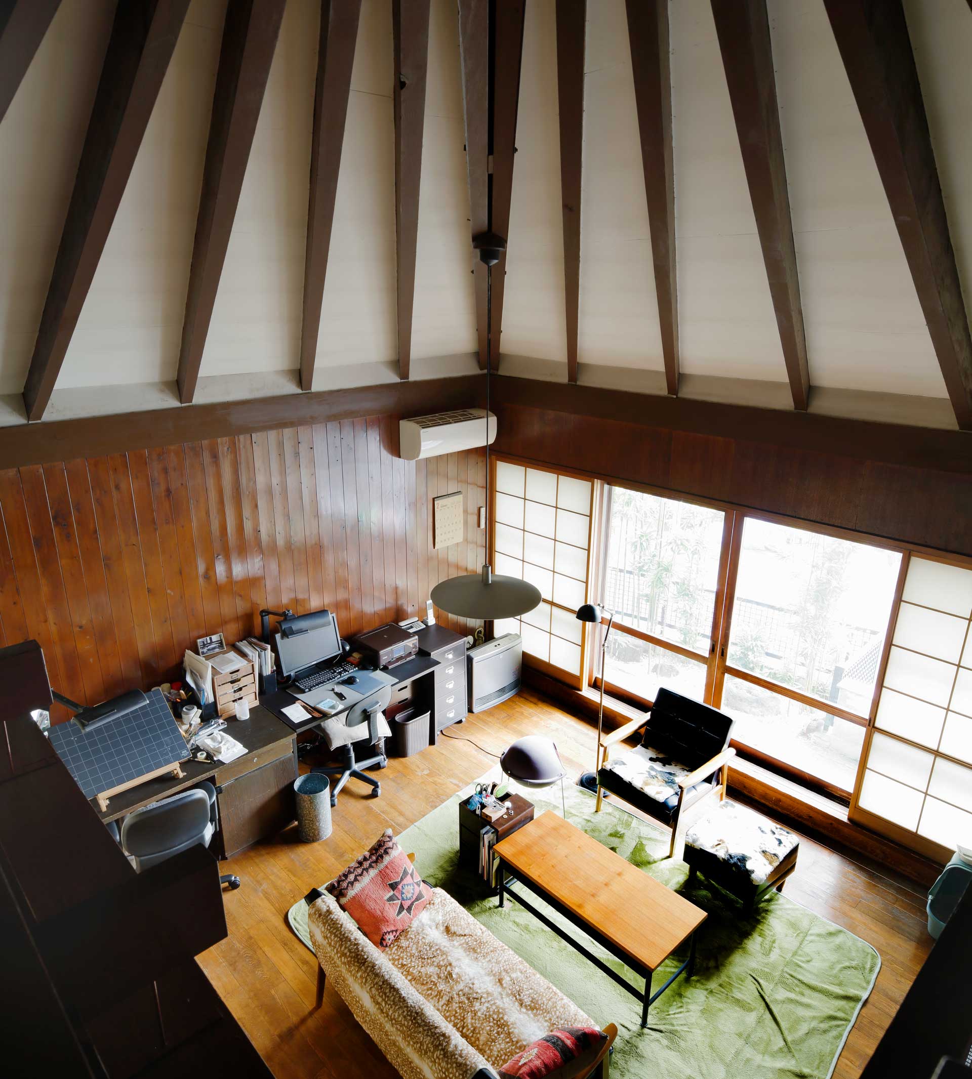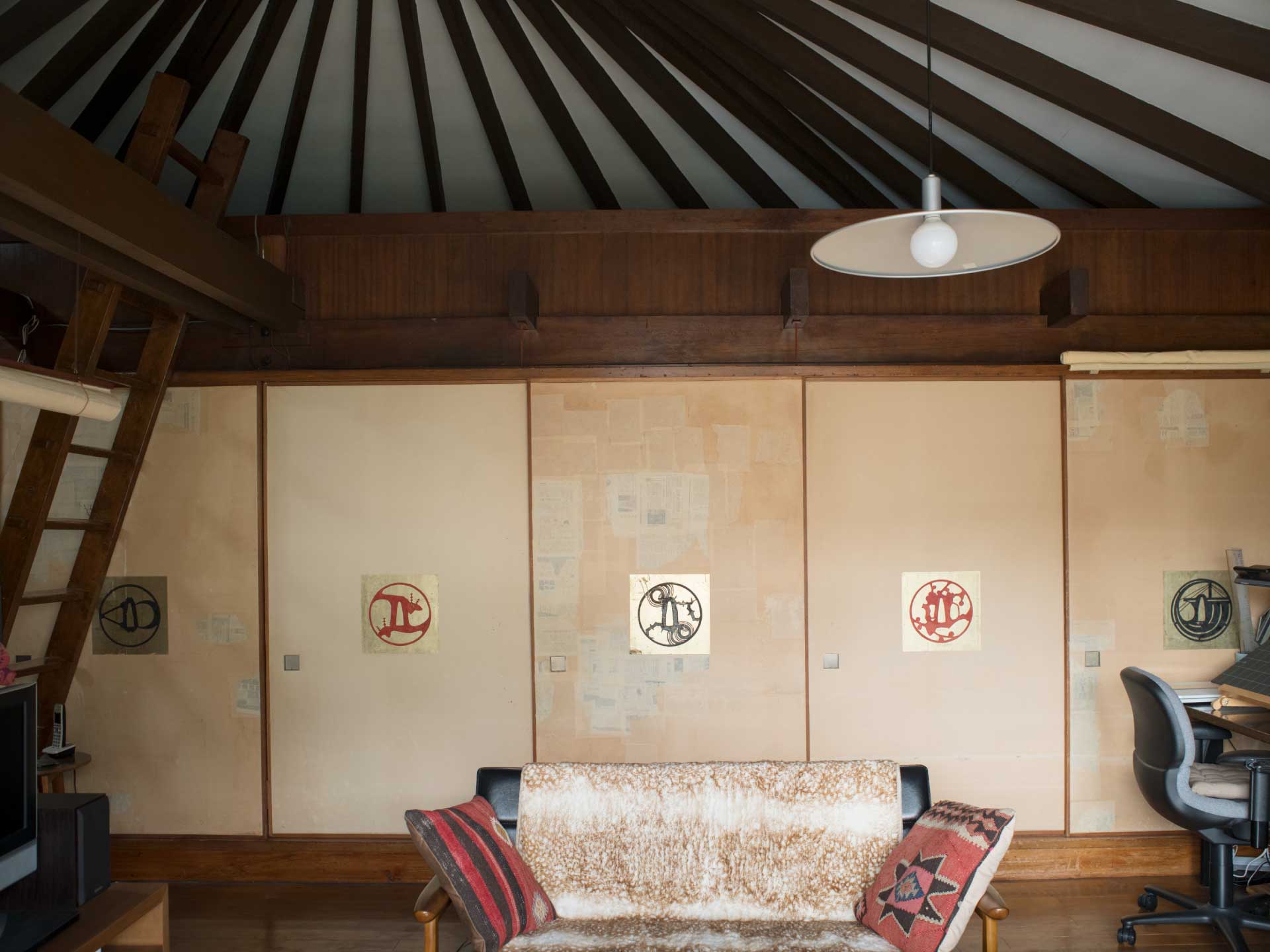 ふすまがひかれて寝室が閉ざされると5つの絵が広間に向かって並ぶ。30㎝角の金地の上に墨とさび朱で画かれた朝倉摂さんの絵はインテリア・デザインに直接参加している。しかし、このような小住宅で画家が直接住宅にデザインに参加することを一般化しようと考えているわけではない。 <住宅は芸術である> という私の主張と、このような芸術家との協同の問題とを単純に結びつけないでいただきたい。極端にまで <工業的> な手法によって設計されていてもひとつずつ設計される住宅の現代社会における存在理由は <芸術> になることだというのが小論の内容であって、この小さな家における協同はあくまで画家と建築家との創作上の問題に焦点を合わしているのである。もし、一般的な問題を引出すとすれば、このふすま絵はシルクスクリーン・プロセスかあるいは版画による印刷によって一般化が可能であり、ふすまや壁のデザインに新しい手法をひとつ加えうると私たちは考えている。