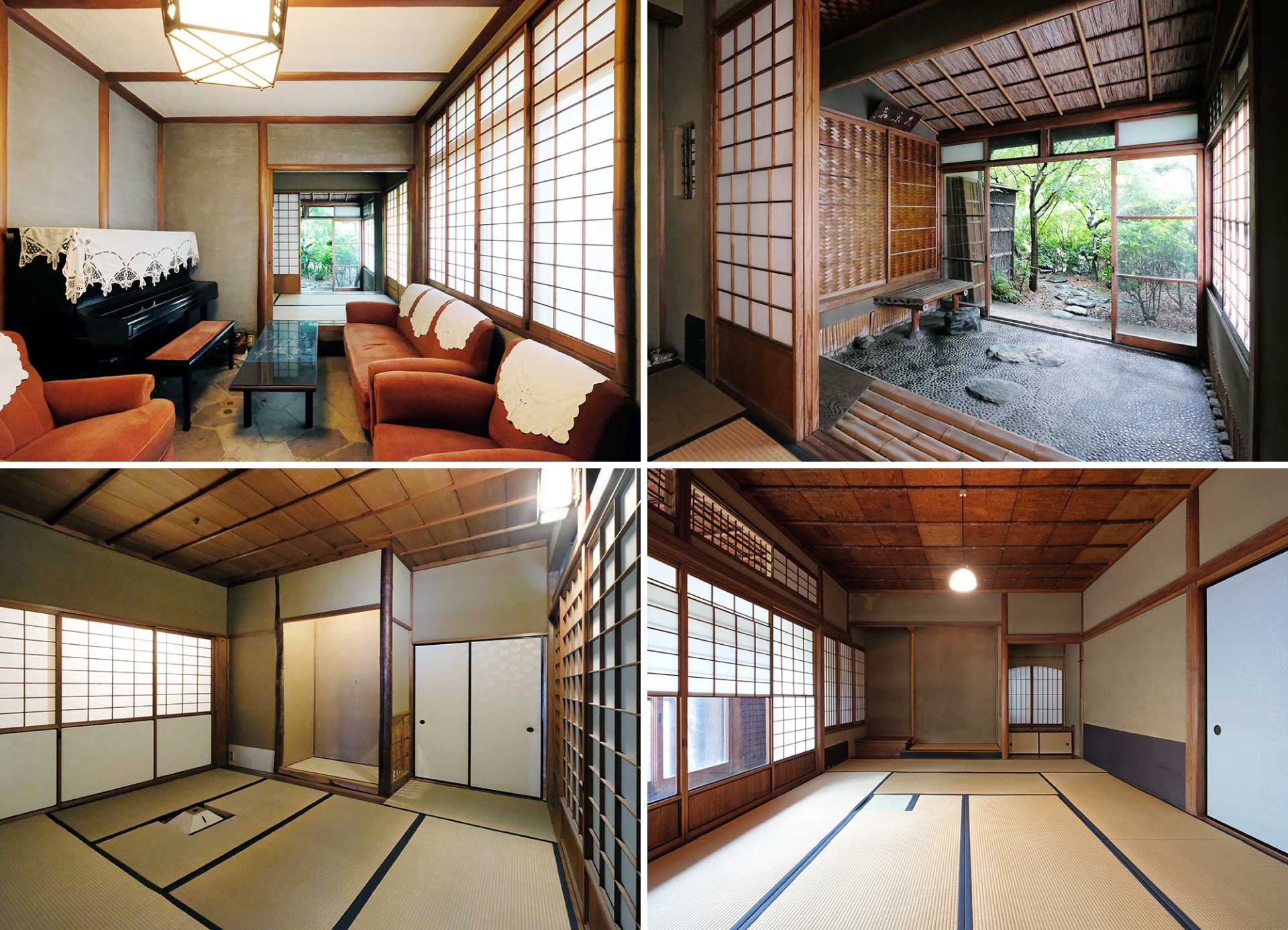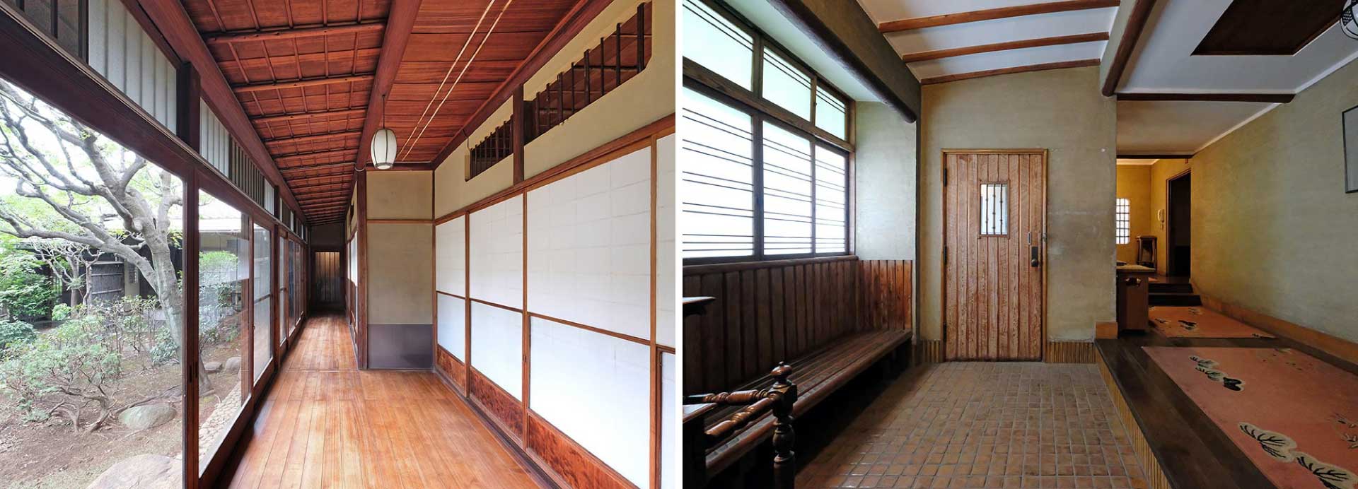 数江家住宅は平屋建ての「玄関・茶室棟」と2階建ての「居室棟」から構成されています。玄関ホ-ルは洋風と数寄屋が混ぜ合わされた和洋折衷空間で、玄関脇の洋風応接室は細身の吉野丸太を柱と廻縁と天井の棹に用いたモダンな造りで縦長の洋風窓には障子が使われるなど、随所に巧みな和洋折衷の手法が試みられています。