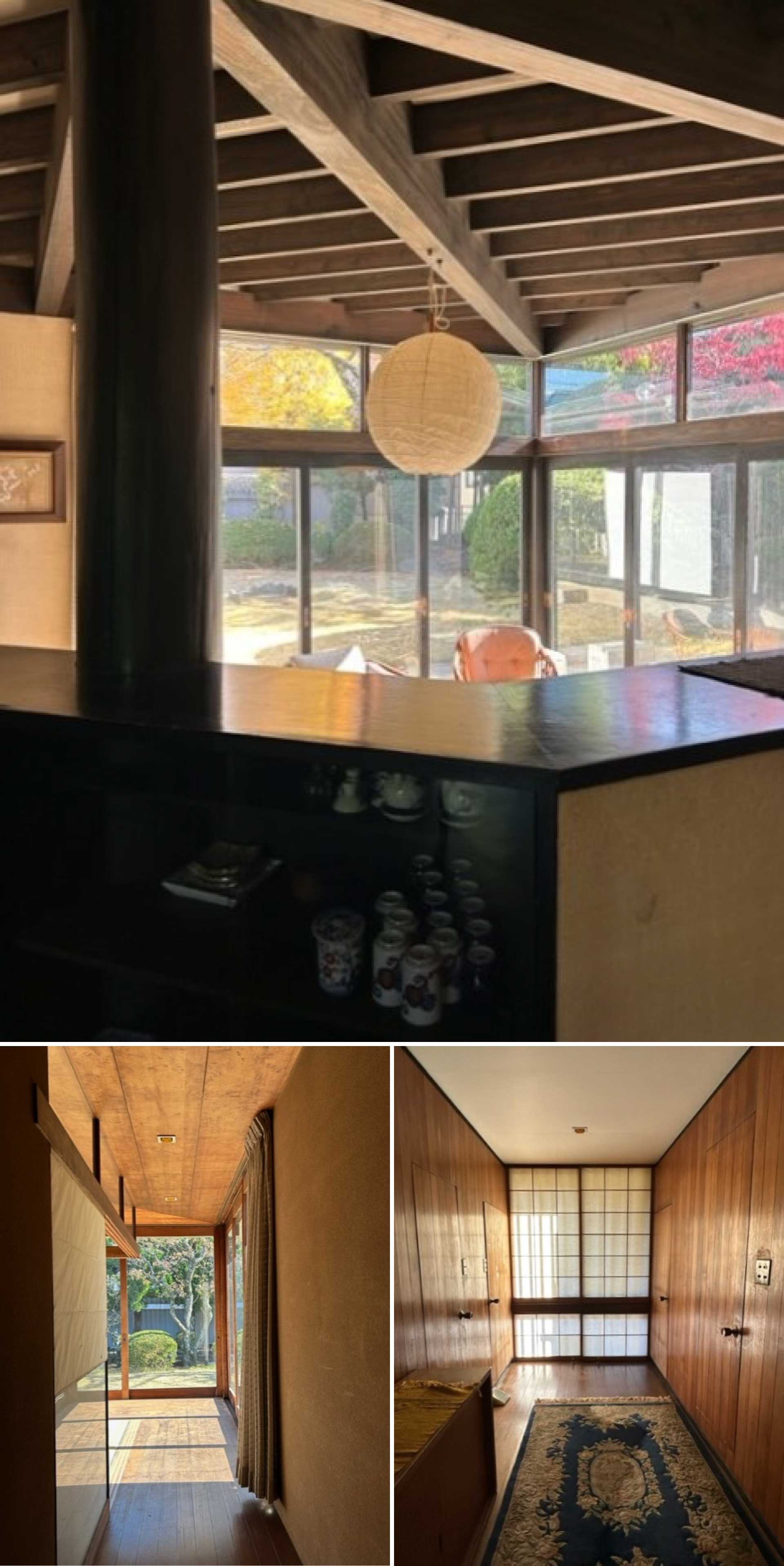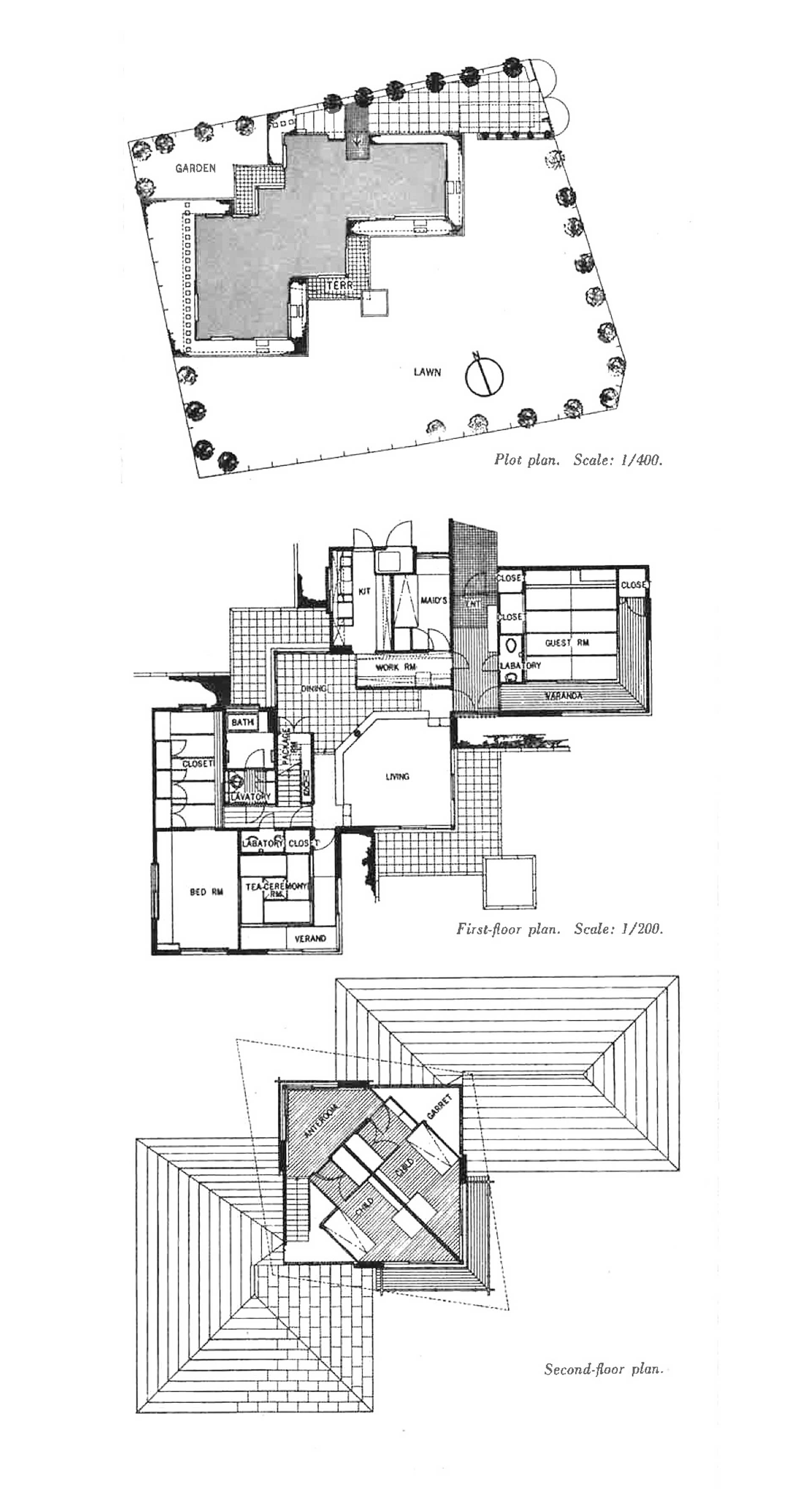 この住宅は東京近郊の恵まれた広さを持つ敷地に今も建つ。設計は東京大学出身で岸田日出刀の最晩年の弟子でもある高橋昭である。敷地の北西に椿や山茶花を配した北庭を、南東に桜や梅といった花木を配した南庭をもつ。平面は東、中央、西の3ブロックかで構成され、南に向かって45度の方向に開放された空間構成である。外観は東と西が寄棟、2階に子供室の乗る中央部がこの45度の対角軸を棟とする独自の形態を有している。中央部の1階は北庭に食堂が面し、南庭と同一レベルにあるリビングは直径5寸の杉丸太柱が支える2階床の架構があらわしとなった力動的空間となっている。一方、東西の和室は新日本調とも言える穏やかなしつらえである。一見、桂離宮を想起させる雁行配置は岸田の名著「過去の構成」からの教えなのかもしれない。施工は現代の宮大工と評された「大文」こと田中文男率いる眞木建設である。