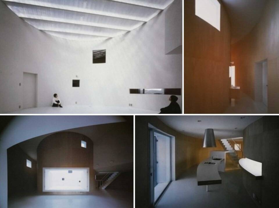 これらの与条件と、冬の寒さや雪のことから、どこにでも開口が取れる鉄筋コンクリート壁式構造を選択した。平面的には、自然の均質空間の方向性のなさを持続できるのは、円形がもっとも可能性があると判断し、実施案が決定された。また断面的には、方向性が唯一見られる敷地の傾斜に対応し、それとほぼ同じ勾配で、傾斜と逆の向きに屋根勾配が決められている。これらによって、円形と、緩やかに変化するリング状のふたつのワンルームを得ている。前者を全面トップライトによる、自然光あふれるアトリエとし、後者はキッチン、ダイニングや、一部吹抜けには寝室が東面して配され、生活のための諸機能を納めたリビングに当てられている。