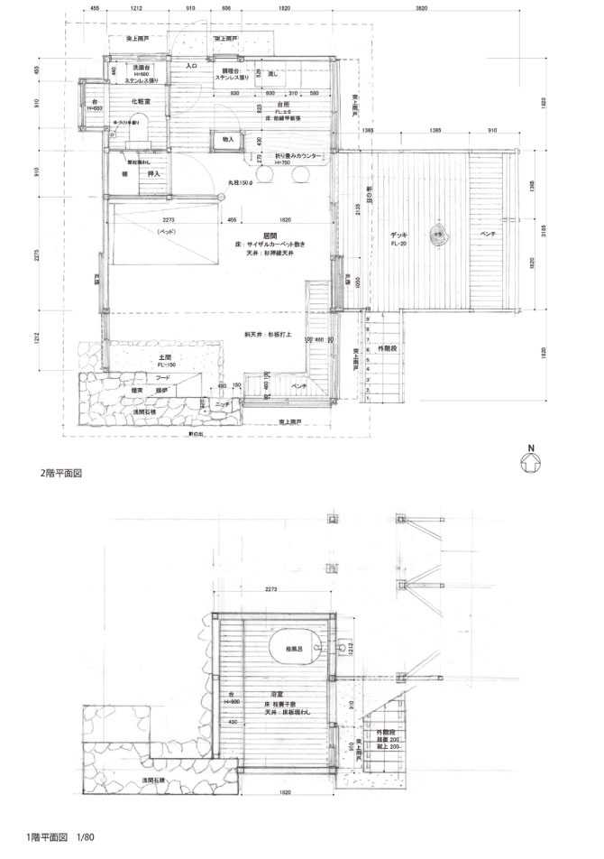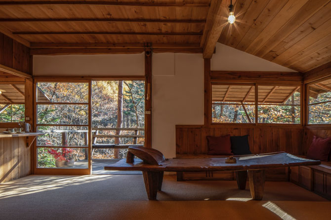この建物は離れ家として建てられた。2階部分が主な生活の場で、居間の部分を含んだ 9.5坪のシンプルな空間があり、斜面の下部の1階は2坪の浴室があるのみで、計11坪のコンパクトな山荘であるが、13畳の居間から外部に広がるデッキは、7.5畳もあり、デッキの先端に跳ね出された部分には寝そべることのできる大きなベンチがある。居間の奥の部分には当初 ベッドが置かれていて、その部分には竿縁天井が張られている。ベッドの位置から落ち着いた天井があり、 外には大きな木の貫通したデッキを通して見える森の景色は、ツリーハウスにいる感覚である。