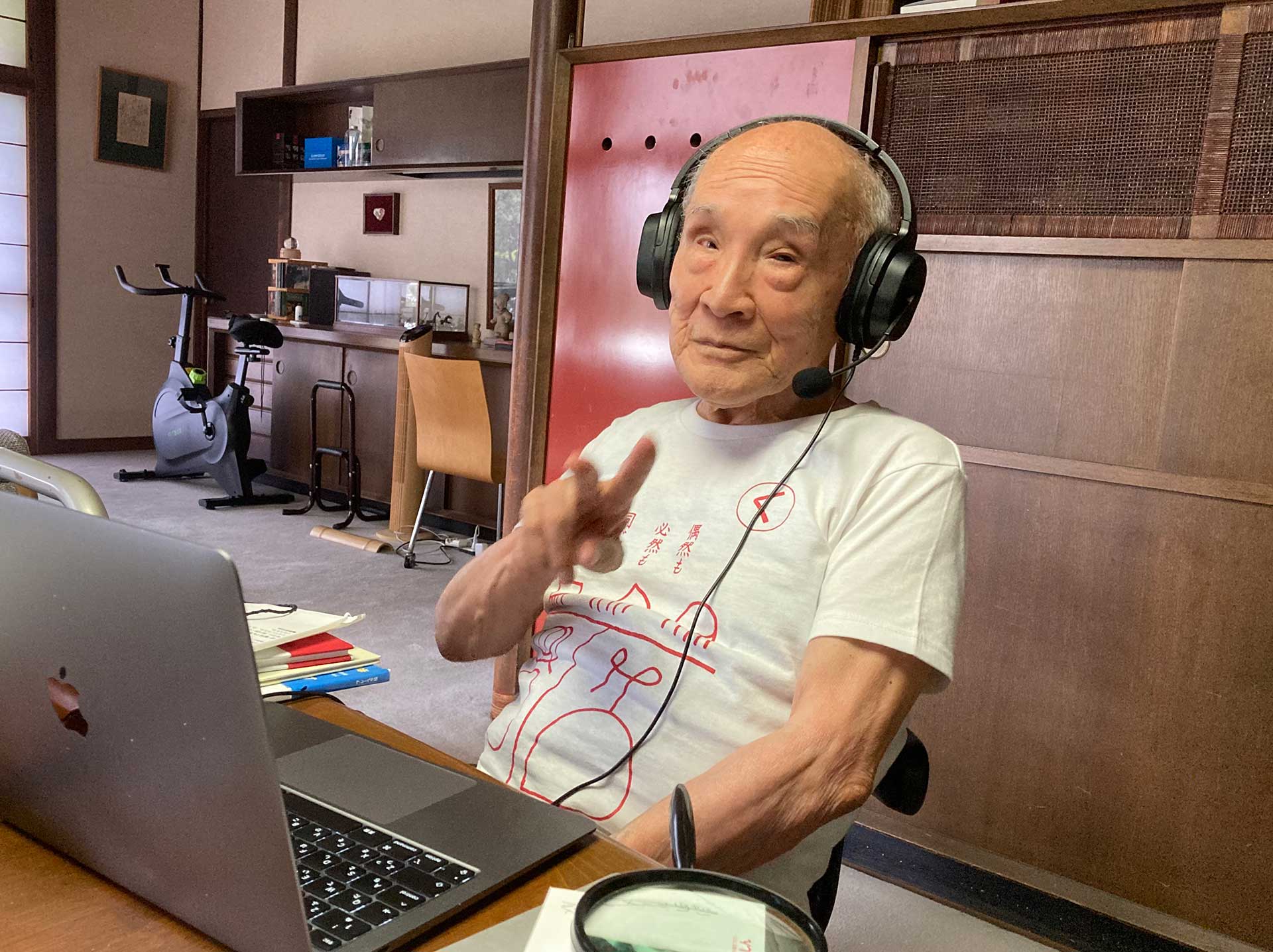 80歳代半ばに足が弱くなった父に、階段の昇り降りが心配なのでC邸に日常生活を移してくれと頼みました。90歳になったら、と言っていましたが、その2、3年後に自分で決心してC邸を生活の場にしました。晩年は、毎朝起きるとリビングの庭の見える場所に座りコーヒーを飲んでいました。そしてダイニングテーブルでマックブックを使って詩を書いていました。朝日新聞に一番最後の詩として掲載された「感謝」はリビングで庭を見ながら書いた詩です。