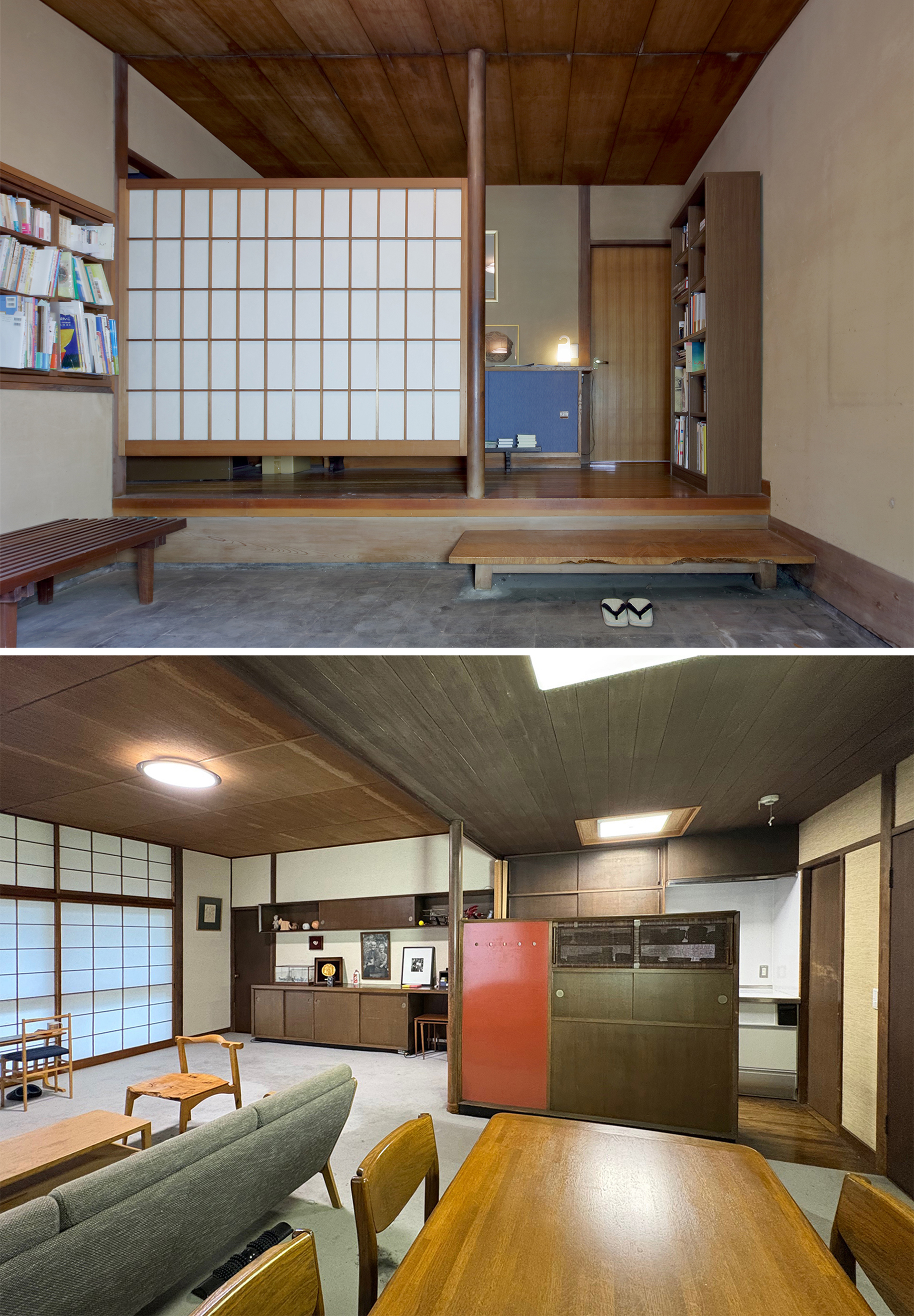 随所に設けられた豊富な収納は、哲学者・詩⼈という知的⽣産を営む住⼈たちの⽣活を⽀え、蔵書や資料を多く抱えながらも、空間の秩序を保つことを可能にしていた。居間、寝室、⽔回り、⽞関ホールは段差を抑えながら⼀周できる平⾯構成となっており、当時まだ⼀般的ではなかった⾼齢者への配慮、すなわち今⽇的な意味でのバリアフリーの思想がすでに実践されている点も注⽬される。ここには、住まい⼿の⾝体と⽇常に寄り添う空間を追求した、浜⼝ミホの設計理念が明確に表れている。